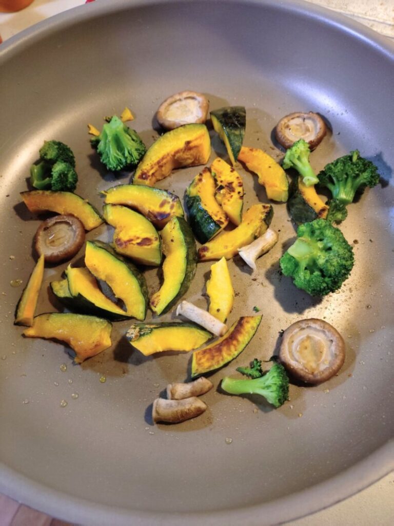 焼いている間にお風呂に入って、付け合わせの野菜とキノコを焼きました。